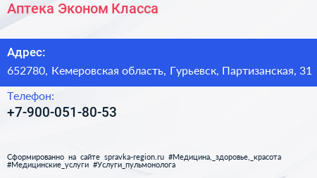 Аптека Эконом Класса по адресу 652780, Кемеровская область, Гурьевск, Партизанская, 31 в дальнейшем Организация, размещена в следующих категориях: