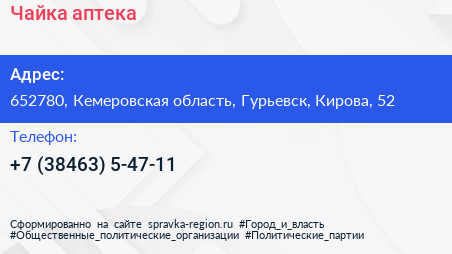 Чайка, аптека по адресу 652780, Кемеровская область, Гурьевск, Кирова, 52 в дальнейшем Организация, размещена в следующих категориях: