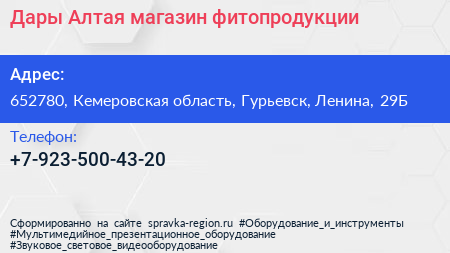 Дары Алтая, магазин фитопродукции по адресу 652780, Кемеровская область, Гурьевск, Ленина, 29Б в дальнейшем Организация, размещена в следующих категориях: