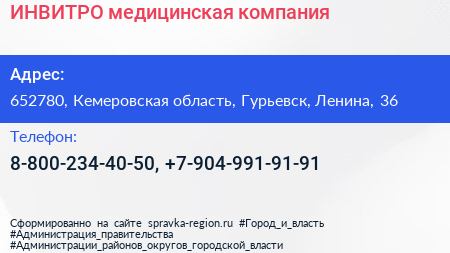 ИНВИТРО, медицинская компания по адресу 652780, Кемеровская область, Гурьевск, Ленина, 36 в дальнейшем Организация, размещена в следующих категориях: