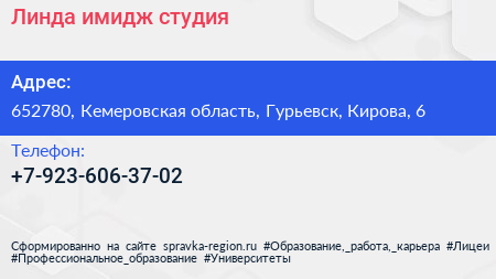 Линда, имидж-студия по адресу 652780, Кемеровская область, Гурьевск, Кирова, 6 в дальнейшем Организация, размещена в следующих категориях: