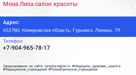 Мона Лиза, салон красоты по адресу 652780, Кемеровская область, Гурьевск, Ленина, 79 в дальнейшем Организация, размещена в следующих категориях: