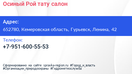 Осиный Рой, тату-салон по адресу 652780, Кемеровская область, Гурьевск, Ленина, 42 в дальнейшем Организация, размещена в следующих категориях: