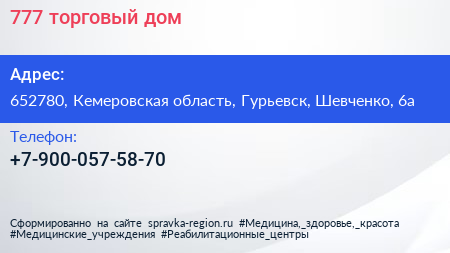 777, торговый дом по адресу 652780, Кемеровская область, Гурьевск, Шевченко, 6а в дальнейшем Организация, размещена в следующих категориях: