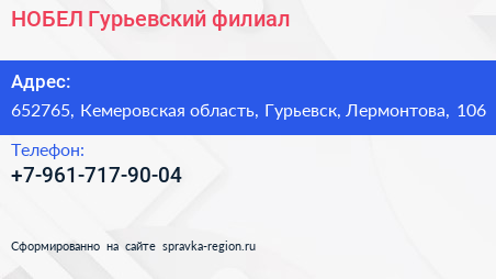 НОБЕЛ, Гурьевский филиал по адресу 652765, Кемеровская область, Гурьевск, Лермонтова, 106 в дальнейшем Организация, размещена в следующих категориях:
