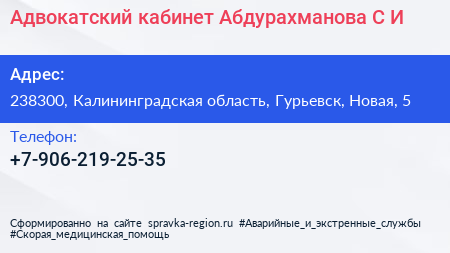 Адвокатский кабинет Абдурахманова С.И. по адресу 238300, Калининградская область, Гурьевск, Новая, 5 в дальнейшем Организация, размещена в следующих категориях: