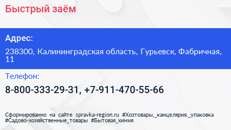 Быстрый заём по адресу 238300, Калининградская область, Гурьевск, Фабричная, 11 в дальнейшем Организация, размещена в следующих категориях:
