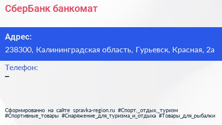 СберБанк, банкомат по адресу 238300, Калининградская область, Гурьевск, Красная, 2а в дальнейшем Организация, размещена в следующих категориях: