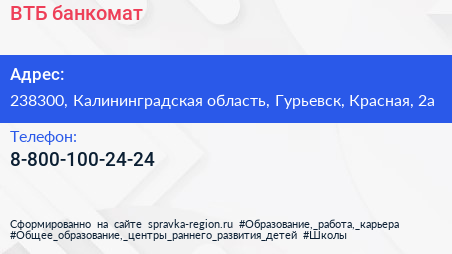 ВТБ, банкомат по адресу 238300, Калининградская область, Гурьевск, Красная, 2а в дальнейшем Организация, размещена в следующих категориях: