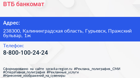 ВТБ, банкомат по адресу 238300, Калининградская область, Гурьевск, Пражский бульвар, 1ж в дальнейшем Организация, размещена в следующих категориях: