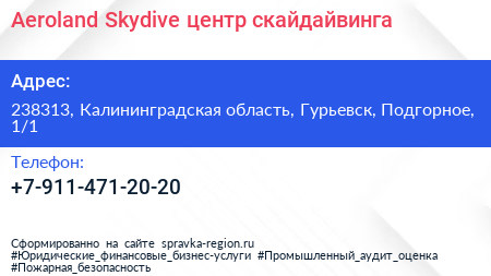 Aeroland Skydive, центр скайдайвинга по адресу 238313, Калининградская область, Гурьевск, Подгорное, 1/1 в дальнейшем Организация, размещена в следующих категориях: