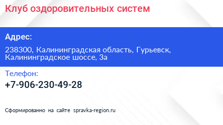 Клуб оздоровительных систем по адресу 238300, Калининградская область, Гурьевск, Калининградское шоссе, 3а в дальнейшем Организация, размещена в следующих категориях: