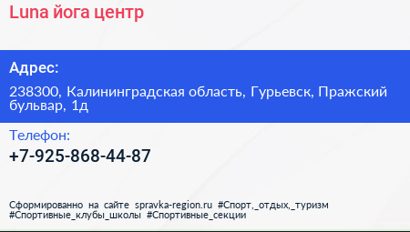 Luna, йога-центр по адресу 238300, Калининградская область, Гурьевск, Пражский бульвар, 1д в дальнейшем Организация, размещена в следующих категориях: