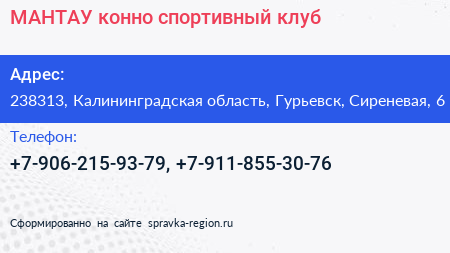 МАНТАУ, конно-спортивный клуб по адресу 238313, Калининградская область, Гурьевск, Сиреневая, 6 в дальнейшем Организация, размещена в следующих категориях: