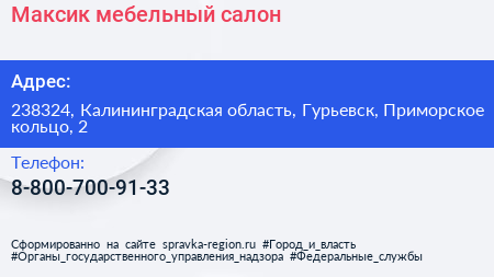 Максик, мебельный салон по адресу 238324, Калининградская область, Гурьевск, Приморское кольцо, 2 в дальнейшем Организация, размещена в следующих категориях: