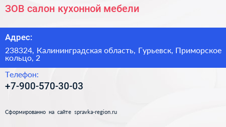ЗОВ, салон кухонной мебели по адресу 238324, Калининградская область, Гурьевск, Приморское кольцо, 2 в дальнейшем Организация, размещена в следующих категориях: