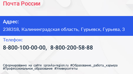 Почта России по адресу 238318, Калининградская область, Гурьевск, Гурьева, 3 в дальнейшем Организация, размещена в следующих категориях: