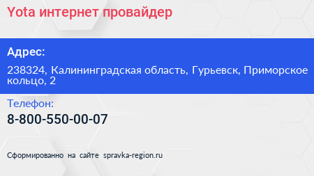 Yota, интернет-провайдер по адресу 238324, Калининградская область, Гурьевск, Приморское кольцо, 2 в дальнейшем Организация, размещена в следующих категориях: