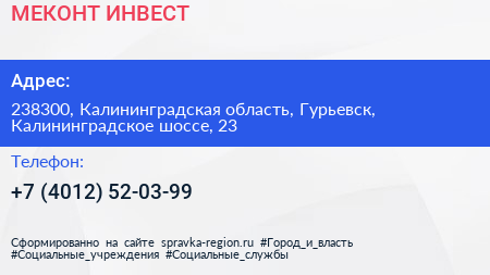 МЕКОНТ ИНВЕСТ по адресу 238300, Калининградская область, Гурьевск, Калининградское шоссе, 23 в дальнейшем Организация, размещена в следующих категориях: