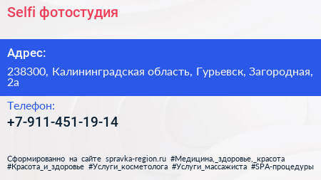 Selfi, фотостудия по адресу 238300, Калининградская область, Гурьевск, Загородная, 2а в дальнейшем Организация, размещена в следующих категориях: