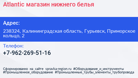 Atlantic, магазин нижнего белья по адресу 238324, Калининградская область, Гурьевск, Приморское кольцо, 2 в дальнейшем Организация, размещена в следующих категориях:
