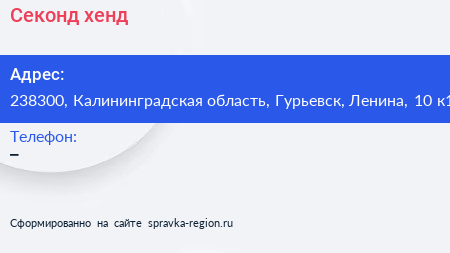 Секонд-хенд по адресу 238300, Калининградская область, Гурьевск, Ленина, 10 к1 в дальнейшем Организация, размещена в следующих категориях: