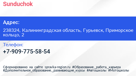 Sunduchok по адресу 238324, Калининградская область, Гурьевск, Приморское кольцо, 2 в дальнейшем Организация, размещена в следующих категориях: