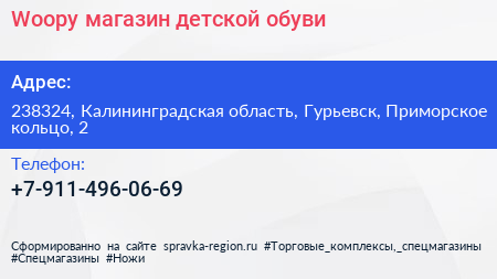 Woopy, магазин детской обуви по адресу 238324, Калининградская область, Гурьевск, Приморское кольцо, 2 в дальнейшем Организация, размещена в следующих категориях: