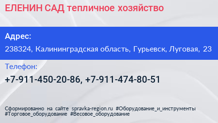 ЕЛЕНИН САД, тепличное хозяйство по адресу 238324, Калининградская область, Гурьевск, Луговая, 23 в дальнейшем Организация, размещена в следующих категориях:
