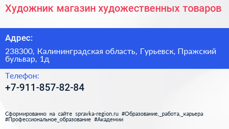 Художник, магазин художественных товаров по адресу 238300, Калининградская область, Гурьевск, Пражский бульвар, 1д в дальнейшем Организация, размещена в следующих категориях: