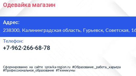 Одевайка, магазин по адресу 238300, Калининградская область, Гурьевск, Советская, 16 в дальнейшем Организация, размещена в следующих категориях: