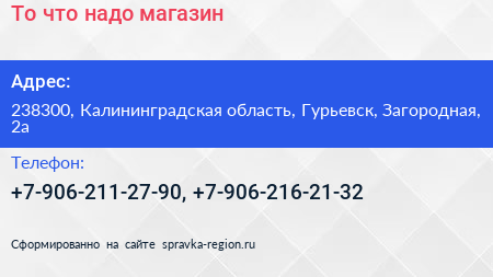 То что надо, магазин по адресу 238300, Калининградская область, Гурьевск, Загородная, 2а в дальнейшем Организация, размещена в следующих категориях: