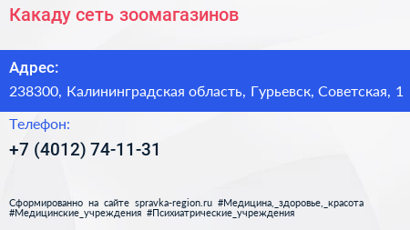 Какаду, сеть зоомагазинов по адресу 238300, Калининградская область, Гурьевск, Советская, 1 в дальнейшем Организация, размещена в следующих категориях: