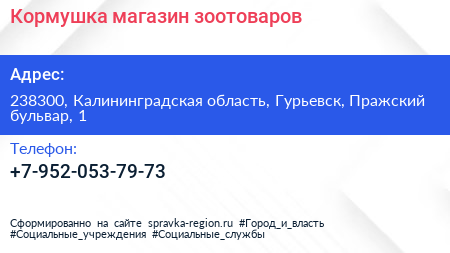 Кормушка, магазин зоотоваров по адресу 238300, Калининградская область, Гурьевск, Пражский бульвар, 1 в дальнейшем Организация, размещена в следующих категориях: