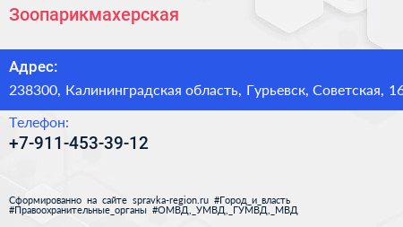 Зоопарикмахерская по адресу 238300, Калининградская область, Гурьевск, Советская, 16 в дальнейшем Организация, размещена в следующих категориях: