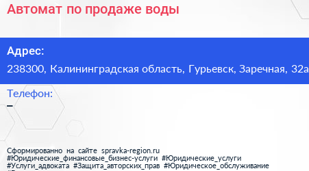 Автомат по продаже воды по адресу 238300, Калининградская область, Гурьевск, Заречная, 32а в дальнейшем Организация, размещена в следующих категориях: