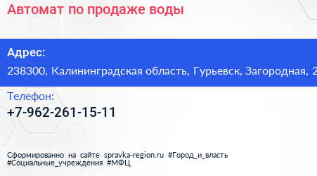 Автомат по продаже воды по адресу 238300, Калининградская область, Гурьевск, Загородная, 2 в дальнейшем Организация, размещена в следующих категориях: