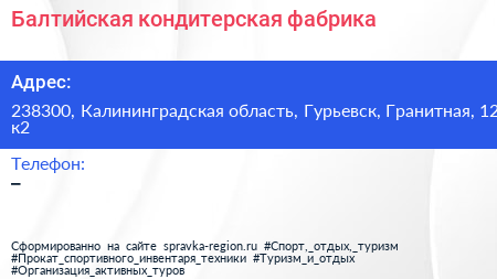 Балтийская кондитерская фабрика по адресу 238300, Калининградская область, Гурьевск, Гранитная, 12 к2 в дальнейшем Организация, размещена в следующих категориях: