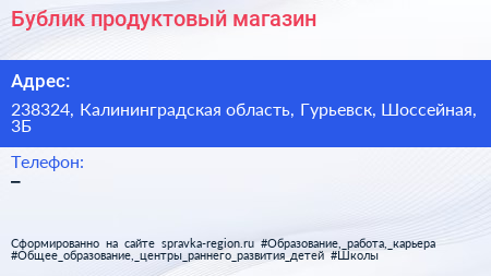 Бублик, продуктовый магазин по адресу 238324, Калининградская область, Гурьевск, Шоссейная, 3Б в дальнейшем Организация, размещена в следующих категориях: