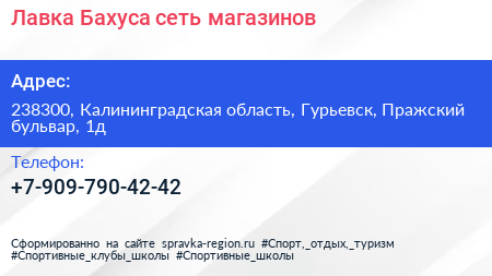 Лавка Бахуса, сеть магазинов по адресу 238300, Калининградская область, Гурьевск, Пражский бульвар, 1д в дальнейшем Организация, размещена в следующих категориях: