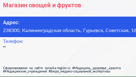 Магазин овощей и фруктов по адресу 238300, Калининградская область, Гурьевск, Советская, 16 в дальнейшем Организация, размещена в следующих категориях: