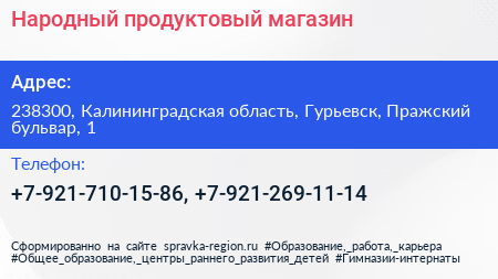 Народный, продуктовый магазин по адресу 238300, Калининградская область, Гурьевск, Пражский бульвар, 1 в дальнейшем Организация, размещена в следующих категориях: