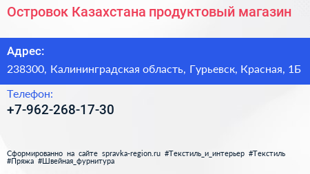 Островок Казахстана, продуктовый магазин по адресу 238300, Калининградская область, Гурьевск, Красная, 1Б в дальнейшем Организация, размещена в следующих категориях:
