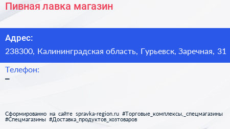 Пивная лавка, магазин по адресу 238300, Калининградская область, Гурьевск, Заречная, 31 в дальнейшем Организация, размещена в следующих категориях: