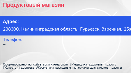 Продуктовый магазин по адресу 238300, Калининградская область, Гурьевск, Заречная, 25а в дальнейшем Организация, размещена в следующих категориях: