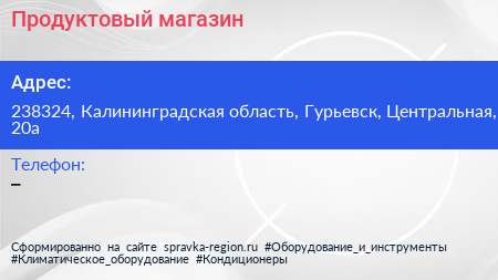 Продуктовый магазин по адресу 238324, Калининградская область, Гурьевск, Центральная, 20а в дальнейшем Организация, размещена в следующих категориях: