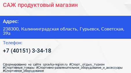САЖ, продуктовый магазин по адресу 238300, Калининградская область, Гурьевск, Советская, 39а в дальнейшем Организация, размещена в следующих категориях: