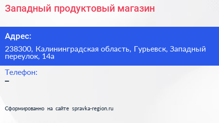 Западный, продуктовый магазин по адресу 238300, Калининградская область, Гурьевск, Западный переулок, 14а в дальнейшем Организация, размещена в следующих категориях: