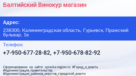Балтийский Винокур, магазин по адресу 238300, Калининградская область, Гурьевск, Пражский бульвар, 1в в дальнейшем Организация, размещена в следующих категориях: