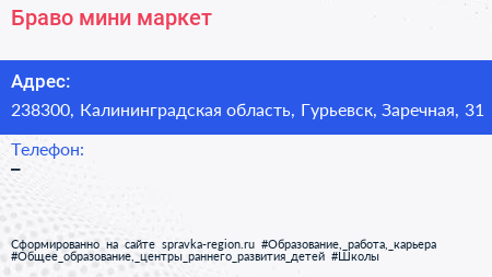 Браво, мини-маркет по адресу 238300, Калининградская область, Гурьевск, Заречная, 31 в дальнейшем Организация, размещена в следующих категориях: